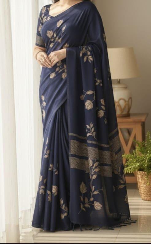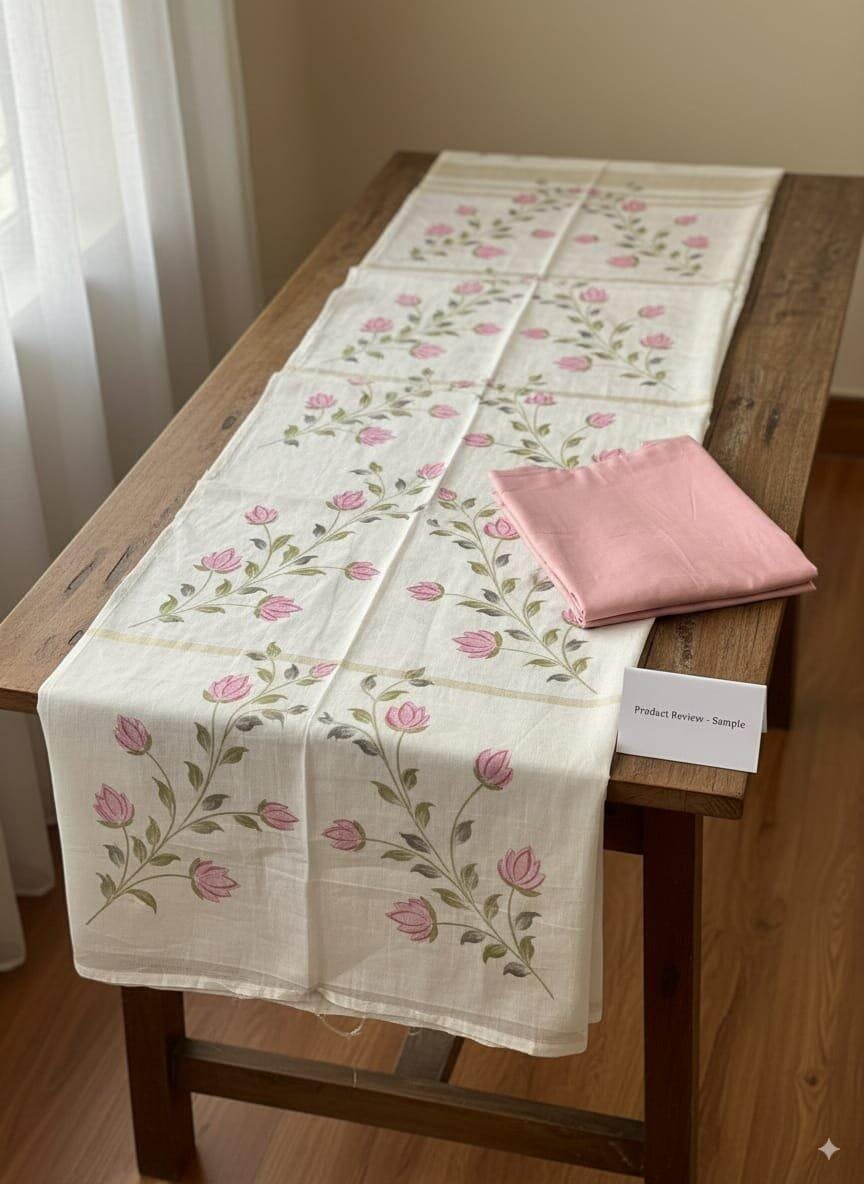 Every saree is adorned with delicate hand-brushed floral patterns, carefully painted by artisans to capture the freshness of blooming flowers. To enhance its charm, intricate handwork detailing is added, making each piece unique and a true work of art.